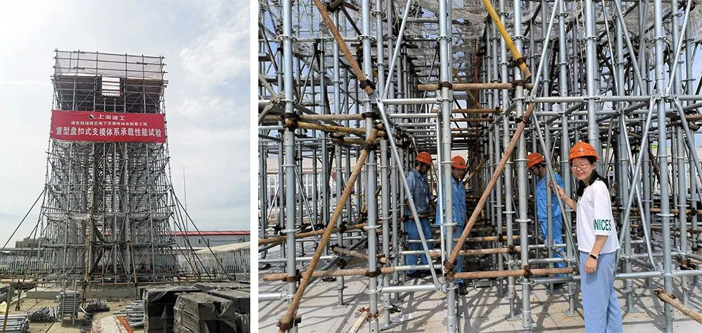 結構所研創(chuàng)團隊頭頂烈日,奮戰(zhàn)在浦東機場南區(qū)地下交通樞紐及配套工程重型盤扣式支模體系承載性能試驗項目中,開展重型盤扣式支模體系承載性能試驗,為浦東機場南區(qū)地下交通樞紐及配套工程支模體系的設計和應用提供技術支撐。
