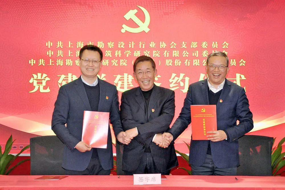忻國樑、楊建榮分別代表上勘設(shè)協(xié)黨支部和上海建科院黨委進行黨建聯(lián)建簽約,武浩代表上勘集團黨委與上勘設(shè)協(xié)黨支部簽約。