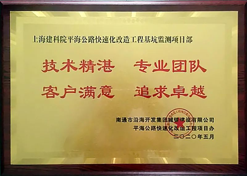 2020年5月,南通市沿海開發(fā)集團(tuán)城鎮(zhèn)建設(shè)有限公司、平海公路快速化改造工程項(xiàng)目辦共同授予上海建科院平海公路快速化改造工程基坑監(jiān)測項(xiàng)目部“技術(shù)精湛、專業(yè)團(tuán)隊(duì)、客戶滿意、追求卓越”。