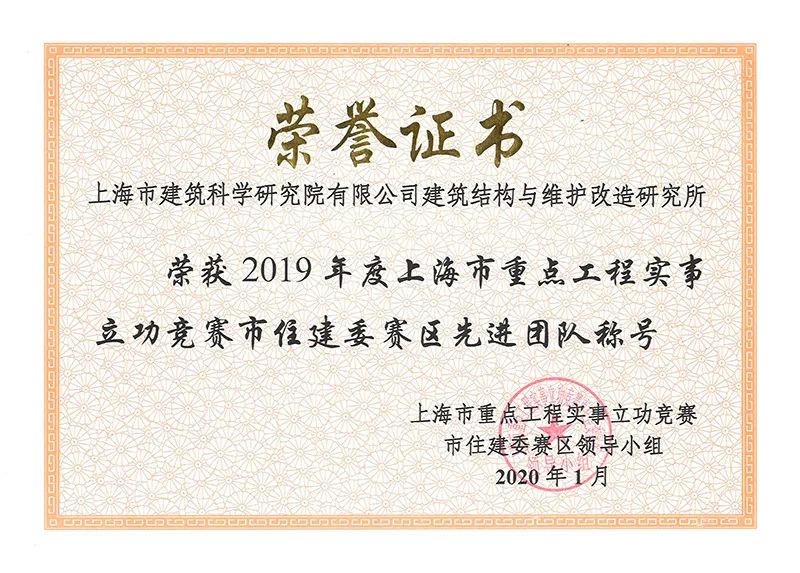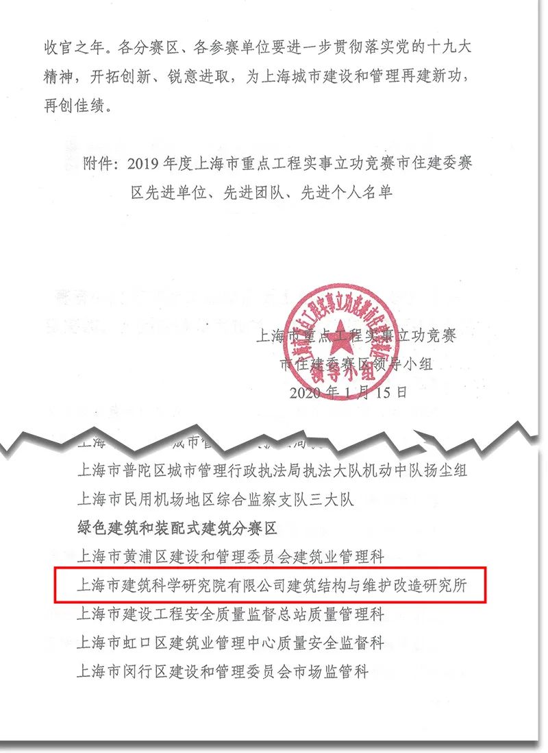2019年度上海市重點(diǎn)工程實(shí)事立功競(jìng)賽市住建委賽區(qū)先進(jìn)集體、先進(jìn)團(tuán)隊(duì)和先進(jìn)個(gè)人頒布,上海市建筑科學(xué)研究院建筑結(jié)構(gòu)與維護(hù)改造研究所榮獲“2019年度上海市重點(diǎn)工程實(shí)事立功競(jìng)賽市住建委賽區(qū)先進(jìn)團(tuán)隊(duì)”稱號(hào)!