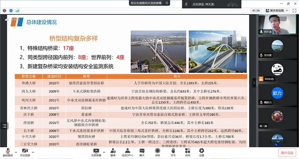 本次培訓(xùn)主要通過線上的模式展開,邀請了來自國內(nèi)各地的八位權(quán)威專家為學(xué)員們授課,包括北京城建設(shè)計發(fā)展集團有限公司姜傳治、中鐵大橋局集團有限公司葉慶旱、杭州市市政設(shè)施發(fā)展中心萬羅為、紹興文理學(xué)院羅帥、同濟大學(xué)夏才初、上海申豐地質(zhì)新技術(shù)應(yīng)用研究所有限公司陳德海、寧波市市政設(shè)施中心何天濤、石家莊鐵道大學(xué)張志國等。研修班大咖云集、權(quán)威授課,主題契合度高、內(nèi)容豐富,專家們圍繞交通基礎(chǔ)設(shè)施領(lǐng)域的基本概念、關(guān)鍵技術(shù)、成果轉(zhuǎn)化、典型應(yīng)用等內(nèi)容進(jìn)行了精彩的分享。