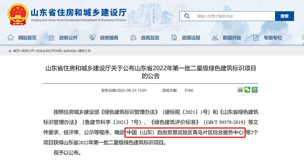 2022年8月23日,由上海市建筑科學(xué)研究院有限公司青島團隊提供技術(shù)服務(wù)的中國(山東)自由貿(mào)易試驗區(qū)青島片區(qū)綜合服務(wù)中心項目榮獲山東省住房和城鄉(xiāng)建設(shè)廳頒發(fā)的“二星級綠色建筑標識證書”,成為山東省首個《綠色建筑評價標準》(GB/T 50378-2019)二星級綠色公共建筑認證項目。