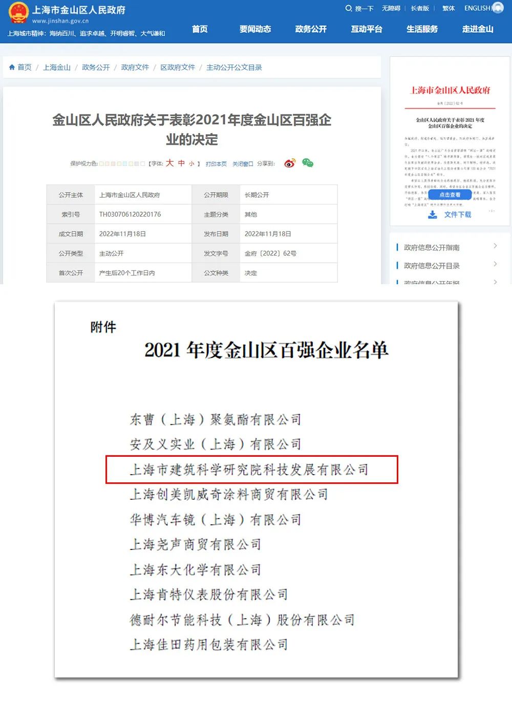 2021年以來,為促進(jìn)金山區(qū)經(jīng)濟平穩(wěn)健康發(fā)展、緊緊圍繞“兩區(qū)一堡”戰(zhàn)略定位,全力塑造“三個灣區(qū)”城市新形象,涌現(xiàn)了一批對區(qū)域發(fā)展作出突出貢獻(xiàn)的優(yōu)秀企業(yè)。上海市金山區(qū)人民政府為表彰先進(jìn)、樹立榜樣,授予此類企業(yè)“2021年度金山區(qū)百強企業(yè)”稱號,上海市建筑科學(xué)研究院有限公司下屬上海市建筑科學(xué)研究院科技發(fā)展有限公司成功榮獲該稱號。