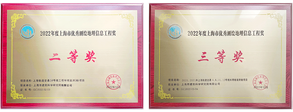 優(yōu)秀測繪地理信息工程是表彰在質(zhì)量、管理和效益等方面優(yōu)秀的測繪地理信息項(xiàng)目。建科院申報(bào)的《上海軌道交通14號線工程環(huán)境監(jiān)測3標(biāo)項(xiàng)目》獲得上海市優(yōu)秀測繪地理信息工程獎(jiǎng)二等獎(jiǎng),《2020、2021年上海軌道交通4、8、11、13號線長期收斂測量項(xiàng)目》獲得上海市優(yōu)秀測繪地理信息工程獎(jiǎng)三等獎(jiǎng)。