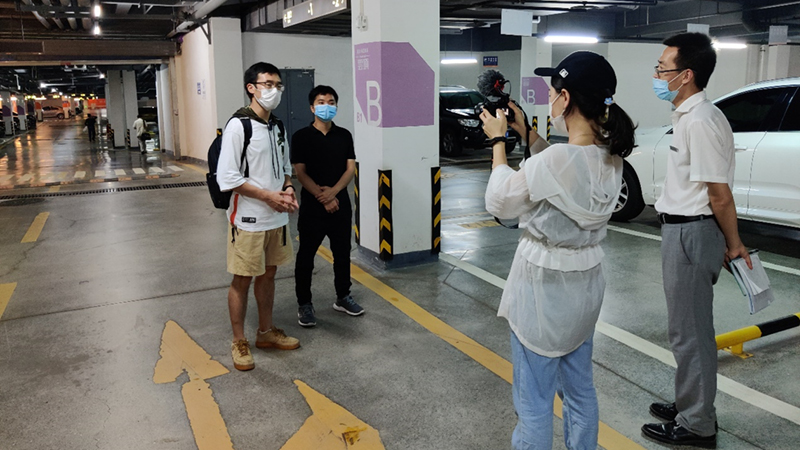 記者在車庫做實況報道。云頂小區(qū)的車庫低洼處設置傳感器,一旦發(fā)生積水就自動抽水排出。