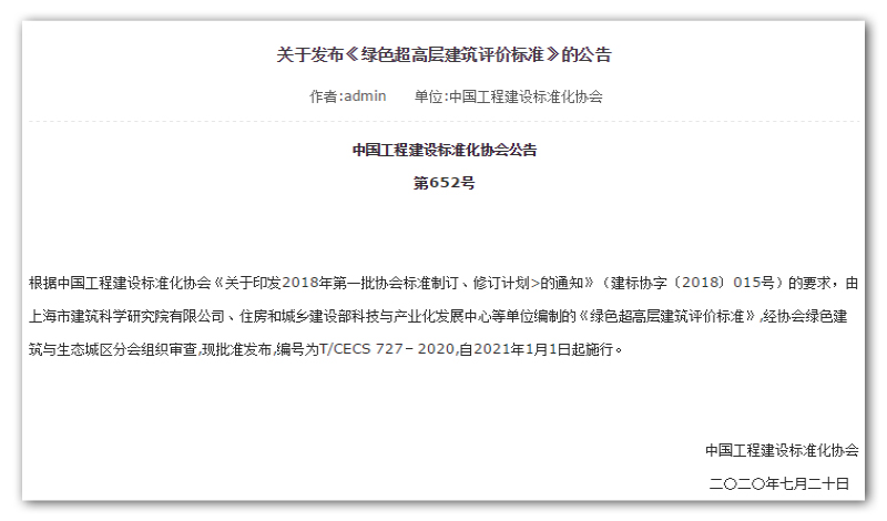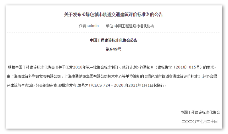 7月20日,中國工程建設標準化協(xié)會(簡稱CECS)正式發(fā)布了《綠色城市軌道交通建筑評價標準》(T/CECS 724-2020)和《綠色超高層建筑評價標準》(T/CECS 727-2020)。兩部標準均于2021年1月1日起正式實施,將為促進城市軌道交通領域和超高層建筑領域的綠色發(fā)展提供標準化技術支撐。