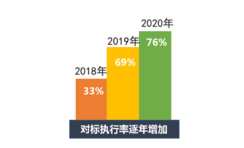 近三年來,參與對標的建筑逐年增加,對標執(zhí)行率持續(xù)上升,2018年為33%,2020年為76%,增長了43%。同時,未達標的建筑數(shù)量也有所減少,對標結(jié)果和數(shù)據(jù)對于樓宇的節(jié)能管理發(fā)揮了一定作用,大大提高了企業(yè)對能效對標工作的關(guān)注度、重視度和認可度,能效對標工作成效已突顯。