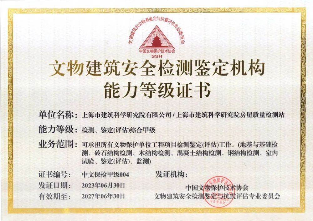 近日,上海市建筑科學研究院有限公司、上海市建筑科學研究院房屋質(zhì)量檢測站通過中國文物保護技術(shù)協(xié)會文物建筑安全檢測鑒定與抗震評估專業(yè)委員會的評審,獲得了《文物建筑安全檢測鑒定機構(gòu)能力等級證書》,能力等級為最高級的檢測、鑒定(評估)綜合甲級,可承擔包括地基與基礎(chǔ)檢測、磚石結(jié)構(gòu)檢測、木結(jié)構(gòu)檢測、混凝土結(jié)構(gòu)檢測、鋼結(jié)構(gòu)檢測、室內(nèi)試驗、鑒定(評估)、監(jiān)測等所有文物保護單位工程項目檢測鑒定(評估)工作,是目前上海市唯一取得該項證書的企業(yè)(機構(gòu))。