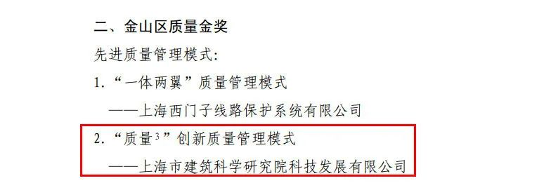 近日,上海金山區(qū)政府研究決定,授予一批先進(jìn)質(zhì)量管理模式和先進(jìn)質(zhì)量管理成果第九屆金山區(qū)政府質(zhì)量獎。其中,上海市建筑科學(xué)研究院有限公司下屬上海市建筑科學(xué)研究院科技發(fā)展有限公司的先進(jìn)質(zhì)量管理模式榮獲金山區(qū)質(zhì)量金獎!