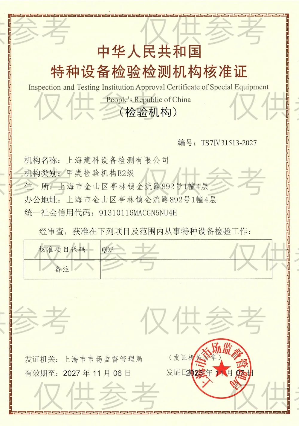 特種設(shè)備檢驗檢測機構(gòu)核準證