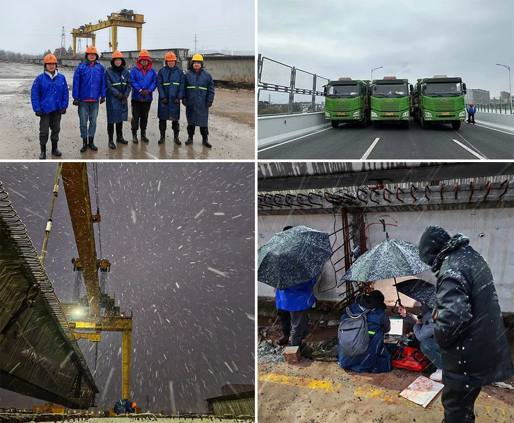 項(xiàng)目組克服贛州二十年一遇的低溫雨雪天氣,與業(yè)主、配合單位高效對(duì)接,做足應(yīng)急預(yù)案,白天冒著雨雪做外業(yè)檢測(cè),晚上加班加點(diǎn)整理數(shù)據(jù)、編制報(bào)告,于1月22日順利完成22片小箱梁靜載試驗(yàn)和3跨成橋荷載試驗(yàn)的外業(yè)檢測(cè)工作,并全體項(xiàng)目組通宵編制、復(fù)核報(bào)告,1月23日順利出具報(bào)告。
