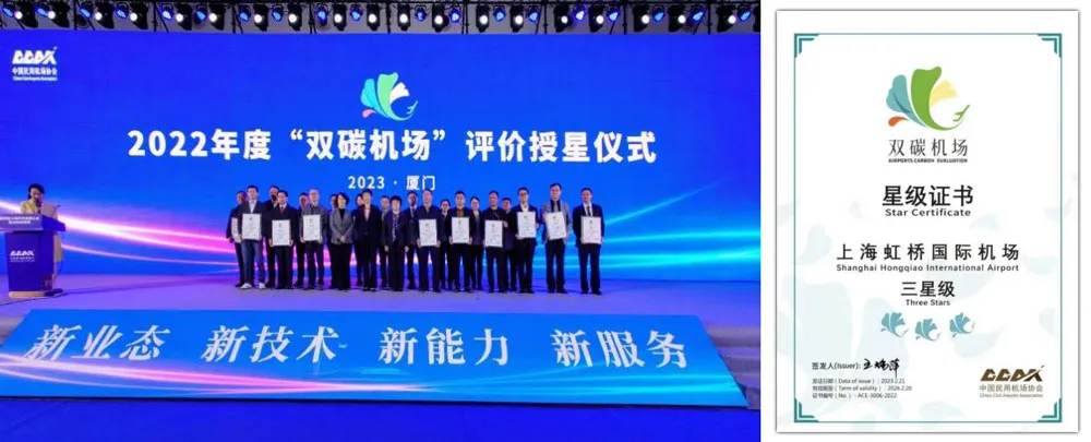2022年度“雙碳機(jī)場”評(píng)價(jià)授星儀式與虹橋機(jī)場獲獎(jiǎng)證書