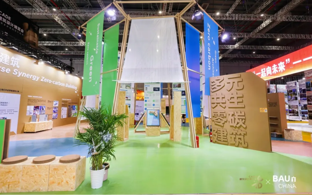 上海建科策劃呈現(xiàn)的“多元共生·零碳建筑”主題展區(qū)利用各類可回收材料搭建展示空間,以零碳建筑知識(shí)體系為先導(dǎo),呈現(xiàn)大量示范性零碳建筑案例,以及各聯(lián)展單位帶來的可持續(xù)建筑體系與技術(shù)集成。