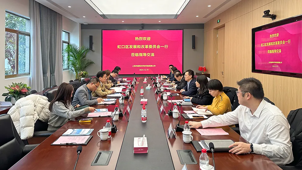 12月19日,上海市虹口區(qū)發(fā)展和改革委員會黨組書記、主任萬建輝一行赴上海市建筑科學研究院有限公司調(diào)研交流。上海建科院黨委書記、執(zhí)行董事楊建榮,市建筑建材業(yè)市場管理總站副站長錢智勇出席接待。虹口區(qū)發(fā)改委副主任沈素子、副主任黃學勤、區(qū)數(shù)據(jù)局、區(qū)建管委有關(guān)領(lǐng)導參加調(diào)研。上海建科院黨委副書記、紀委書記、工會主席張蓓紅,副總經(jīng)理、低碳院院長張穎,以及上海建科院科研管理部、市場發(fā)展部、低碳院相關(guān)業(yè)務負責人參會。