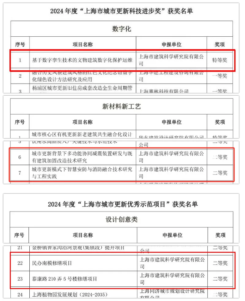 上海市建筑科學(xué)研究院有限公司服務(wù)的數(shù)字化項(xiàng)目“基于數(shù)字孿生技術(shù)的文物建筑數(shù)字化保護(hù)運(yùn)維”榮獲“上海市城市更新科技進(jìn)步獎”特等獎,新材料新工藝項(xiàng)目“城市更新背景下多功能協(xié)同減震裝置研發(fā)與既有建筑加固改造技術(shù)研究”和“城市更新模式下智慧安防與消防融合技術(shù)研究與工程實(shí)踐”榮獲二等獎,設(shè)計(jì)創(chuàng)意類城市更新優(yōu)秀示范項(xiàng)目“民辦南模修繕項(xiàng)目”和“泰康路210弄5號樓修繕項(xiàng)目”榮獲二等獎。