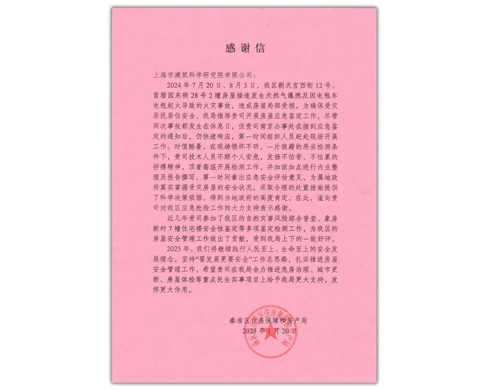 近日,南京市秦淮區(qū)住房保障和房產局向上海市建筑科學研究院有限公司發(fā)來感謝信,就上海建科院南京辦事處配合秦淮區(qū)局推進房屋安全管理工作,尤其在快速響應房屋災后應急安全鑒定方面的支持及做出的成績給予高度肯定并表達感謝。