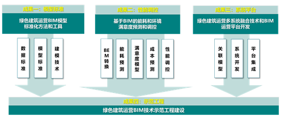 本項(xiàng)目研究歷時(shí)3年,在14家單位組成的“產(chǎn)學(xué)研用”團(tuán)隊(duì)聯(lián)合攻關(guān)下,聚焦當(dāng)前BIM技術(shù)應(yīng)用于國內(nèi)綠色建筑運(yùn)營期存在的方法標(biāo)準(zhǔn)不統(tǒng)一、調(diào)控技術(shù)不完備、系統(tǒng)平臺(tái)不成熟等關(guān)鍵問題,系統(tǒng)開展了面向運(yùn)營的BIM模型及標(biāo)準(zhǔn)、優(yōu)化調(diào)控技術(shù)、軟件及系統(tǒng)管理平臺(tái)、示范工程應(yīng)用等研究,為實(shí)現(xiàn)綠色建筑高效運(yùn)營提供基于BIM的核心技術(shù)和工具。項(xiàng)目累計(jì)形成新技術(shù)成果22項(xiàng),編制標(biāo)準(zhǔn)10部、導(dǎo)則3部、指南2部,申請(qǐng)專利13項(xiàng),獲軟件著作權(quán) 21 項(xiàng),建立行業(yè)共享的模型數(shù)據(jù)庫1個(gè),完成示范工程24項(xiàng),總建筑面積達(dá)到374萬平方米,實(shí)現(xiàn)了能耗比《民用建筑能耗標(biāo)準(zhǔn)》同氣候區(qū)同類建筑約束值降低30%、室內(nèi)環(huán)境用戶滿意度大于75%的性能目標(biāo)。