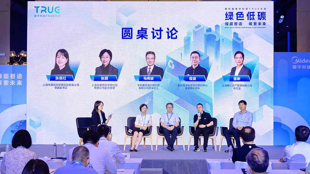 圓桌會議環(huán)節(jié),上海建科院副總經(jīng)理張穎、華東建筑設(shè)計研究院資深總工馬偉駿、美的樓宇科技智能技術(shù)部部長程俊、上海錦江資產(chǎn)管理副總監(jiān)張新四位行業(yè)專家,圍繞綠色低碳建筑發(fā)展核心議題展開思想碰撞。嘉賓們立足政策研究、建筑設(shè)計、技術(shù)研發(fā)、資產(chǎn)管理等差異化視角,就政策標準完善路徑、行業(yè)設(shè)計創(chuàng)新方向、工程運維精細化管理,以及綠色低碳解決方案落地實踐等內(nèi)容各抒己見。經(jīng)深入研討,專家們達成共識:以技術(shù)市場化為驅(qū)動、政策標準化為支撐。