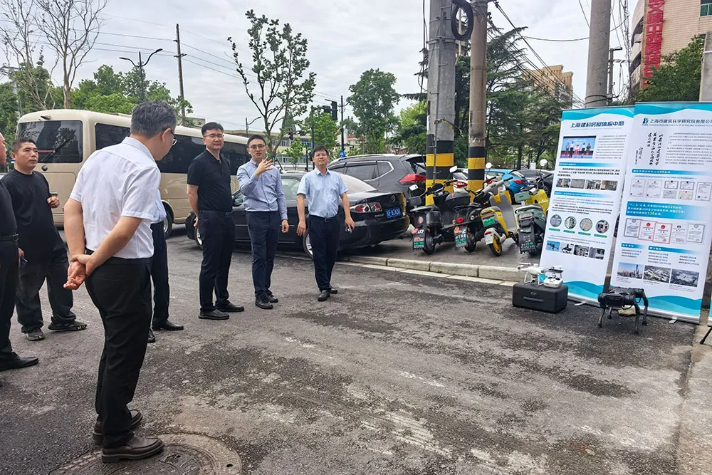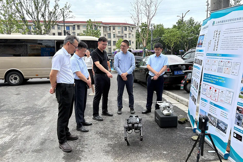 周曉杰一行實(shí)地考察了房屋體檢作業(yè)流程,重點(diǎn)了解圖紙測(cè)繪、居民入戶等環(huán)節(jié)中的重難點(diǎn)問(wèn)題,并聽(tīng)取南通市老舊小區(qū)房屋安全隱患現(xiàn)狀的匯報(bào)。上海建科院結(jié)構(gòu)所區(qū)域拓展中心主任陳馳向調(diào)研組系統(tǒng)介紹了基于南通市房屋體檢導(dǎo)則、融合上海經(jīng)驗(yàn)形成的“無(wú)人機(jī)巡查+人工詳查+專業(yè)判斷”工作模式。現(xiàn)場(chǎng)通過(guò)無(wú)人機(jī)、機(jī)器狗等數(shù)字化設(shè)備演示,直觀呈現(xiàn)了智能化檢測(cè)技術(shù)在房屋結(jié)構(gòu)評(píng)估、隱患識(shí)別中的高效應(yīng)用。調(diào)研組圍繞房屋體檢制度建設(shè)、管理機(jī)制、技術(shù)規(guī)范及成本控制等議題展開(kāi)深入交流。