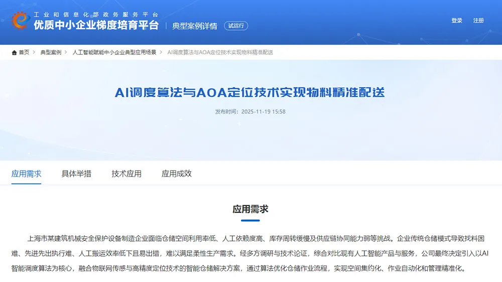 《基于AI調(diào)度與智能感知的倉儲物流協(xié)同優(yōu)化系統(tǒng)》項目成功入選工業(yè)和信息化部“人工智能賦能中小企業(yè)典型應(yīng)用場景”。該項目實現(xiàn)空間集約化、作業(yè)自動化和管理精準(zhǔn)化,為制造型中小企業(yè)人工智能的應(yīng)用提供了可復(fù)制、可推廣的實踐范例。