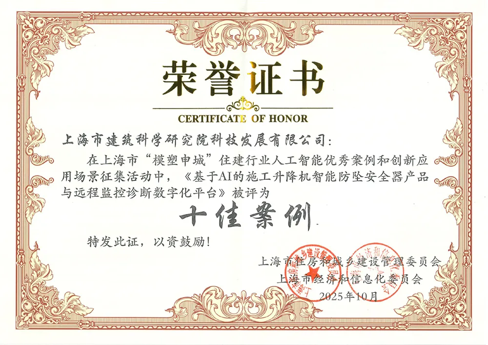 《基于AI的施工升降機智能防墜安全器產(chǎn)品與遠(yuǎn)程監(jiān)控診斷數(shù)字化平臺》項目榮獲上海市“模塑申城”住建行業(yè)人工智能 “十佳案例”。該項目實現(xiàn)了安全防護(hù)從被動響應(yīng)到主動智能的轉(zhuǎn)變,為行業(yè)數(shù)智化轉(zhuǎn)型提供了示范標(biāo)桿。