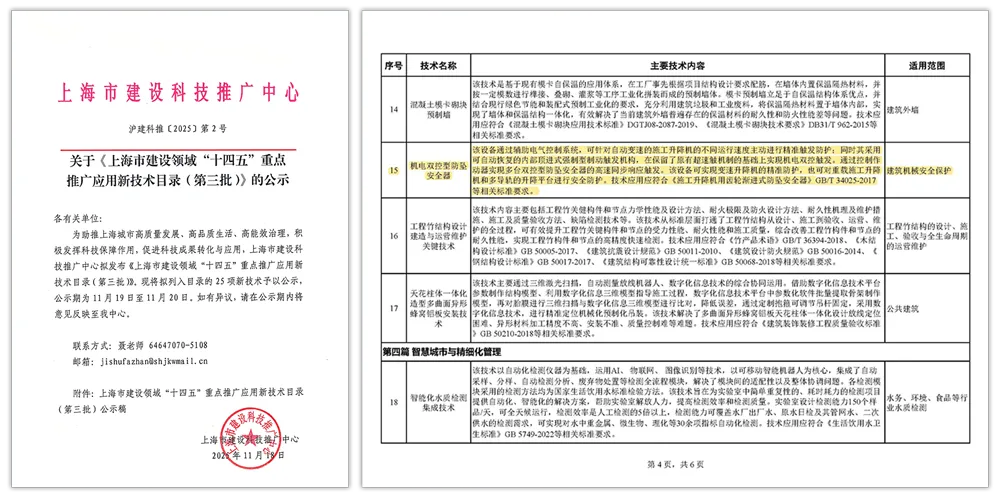 科技公司自主研發(fā)的“機電雙控型防墜安全器”成功入選《上海市建設(shè)領(lǐng)域“十四五”重點推廣應(yīng)用新技術(shù)目錄(第三批)》。該產(chǎn)品采用差速多連桿傳動系統(tǒng)與輔助電氣控制技術(shù),在全球首臺15t智能變速型升降機和智能造樓機中成功應(yīng)用,綜合技術(shù)達(dá)國際先進(jìn)水平。