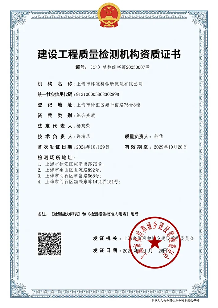近日,經(jīng)上海市住房和城鄉(xiāng)建設(shè)管理委員會正式核準,上海市建筑科學(xué)研究院有限公司(以下簡稱“建科院”)獲頒建設(shè)工程質(zhì)量檢測機構(gòu)綜合資質(zhì)證書【(滬)建檢綜字第20250007號】,躋身行業(yè)最高級別。其資質(zhì)范圍全面覆蓋建筑材料及構(gòu)配件、主體結(jié)構(gòu)及裝飾裝修、鋼結(jié)構(gòu)、地基基礎(chǔ)、建筑節(jié)能、建筑幕墻、市政工程材料、道路工程及橋梁與地下工程九大核心專項,標志著建科院的檢測能力已實現(xiàn)建設(shè)工程質(zhì)量領(lǐng)域核心業(yè)務(wù)的全鏈條貫通。